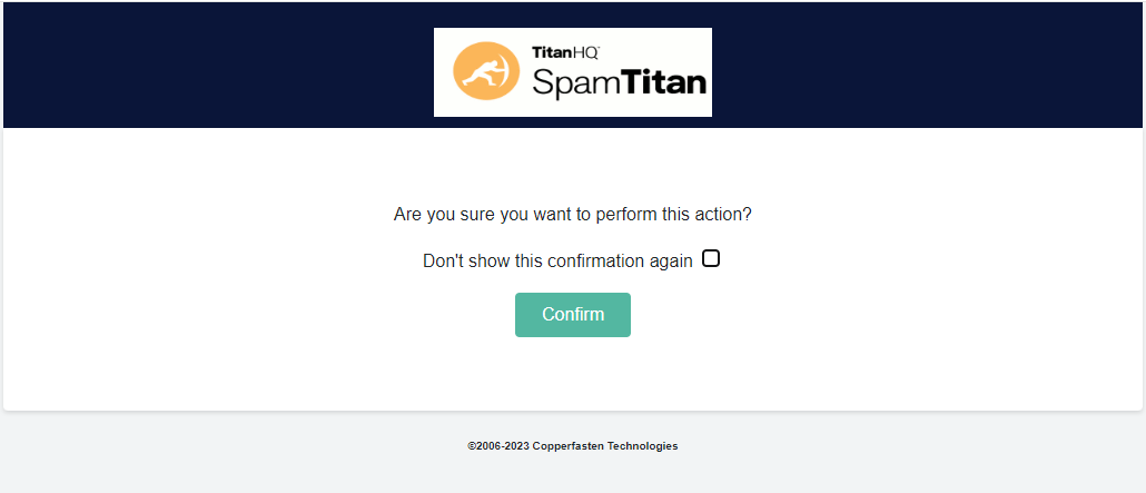 Today, November 5th, we are rolling out a confirm button on quarantine reports to ensure that when links are clicked in your quarantine report that the action is being performed by you, the user, so as to ensure all actions are controlled by you. This is to prevent link checking and detonation software making changes to your report settings without your knowledge,
